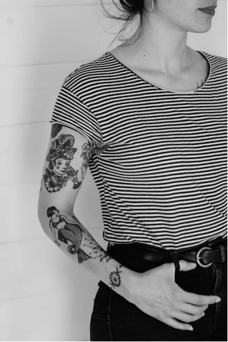 Je tattoo également à l'aiguille, pour me rapprocher d'avantage des motifs d'antan. Avec cette technique, je propose plutôt de petits motifs, plus simplifiés, comme mes "Tatouages de Comptoirs".